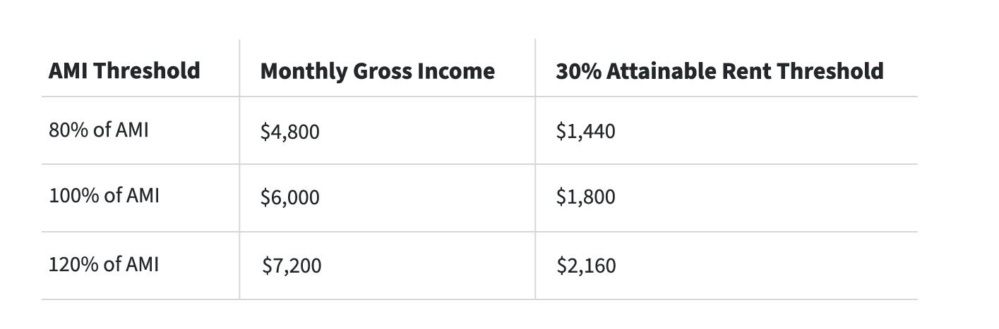 Attainable housing is priced to be affordable for renter households earning slightly below or above the area’s typical income. Housing is considered attainable when its rent does not exceed 30% of the Area Median Income (AMI), which is the 50th percentile gross income for households in a given location.1 However, attainable housing can target residents earning as little as 80% and as much as 120% of the AMI.1