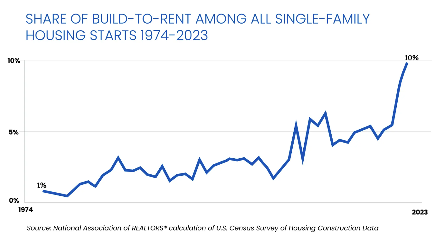 By and large, apartments remain popular: 47.1% of tenant households live in multifamily communities.6 But some alternatives, like build-to-rent single-family rentals, are becoming increasingly sought-after. This concept combines the privacy and living space afforded by a detached single-family home with the amenities, community, convenience, and hassle-free lifestyle provided by a professionally-managed apartment building. In other words, build-to-rent communities are like regular single-family neighborhoods—except they’re designed exclusively with renters in mind. The build-to-rent asset class itself is not new: they’ve been around since the 1980s, though they did not gain serious traction until after the Great Financial Crisis.7 Build-to-rent communities continued to rise in popularity following the pandemic, doubling from 5% of the single-family housing stock in 2021 to 10% of all homes by 2023.8