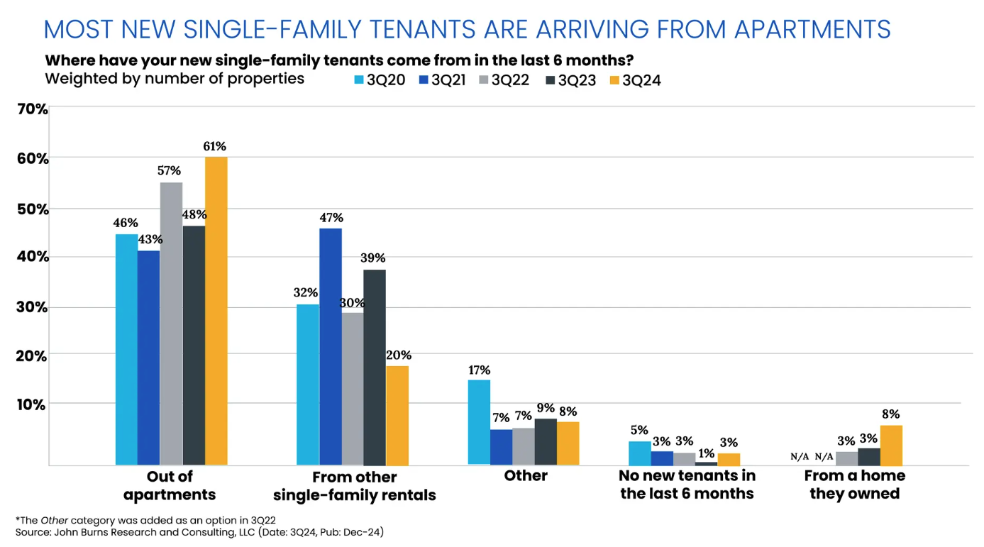 Interestingly, a sizable share of new build-to-rent tenants—about one-fifth of them as of Q3 2024—are trading existing single-family arrangements for amenity-rich, fully-managed build-to-rent communities.9 Still, the lion’s share of new build-to-rent tenants—nearly two-thirds of them in Q3 2024—are multifamily departees.