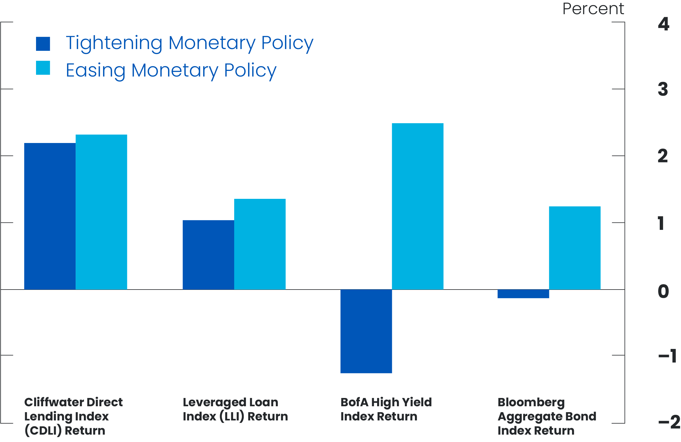Then again, private credit investors arguably have little to fear—regardless of where rates head next. As the same Fed report mentioned previously argues, “direct lending's [i.e. private credit’s] return performance compares favorably to leveraged loans and high-yield bonds in both easing and tightening monetary policy environments.”6 This stands in sharp contrast to publicly-traded investment-grade and high-yield debt, which tends to fare well only during easing cycles.