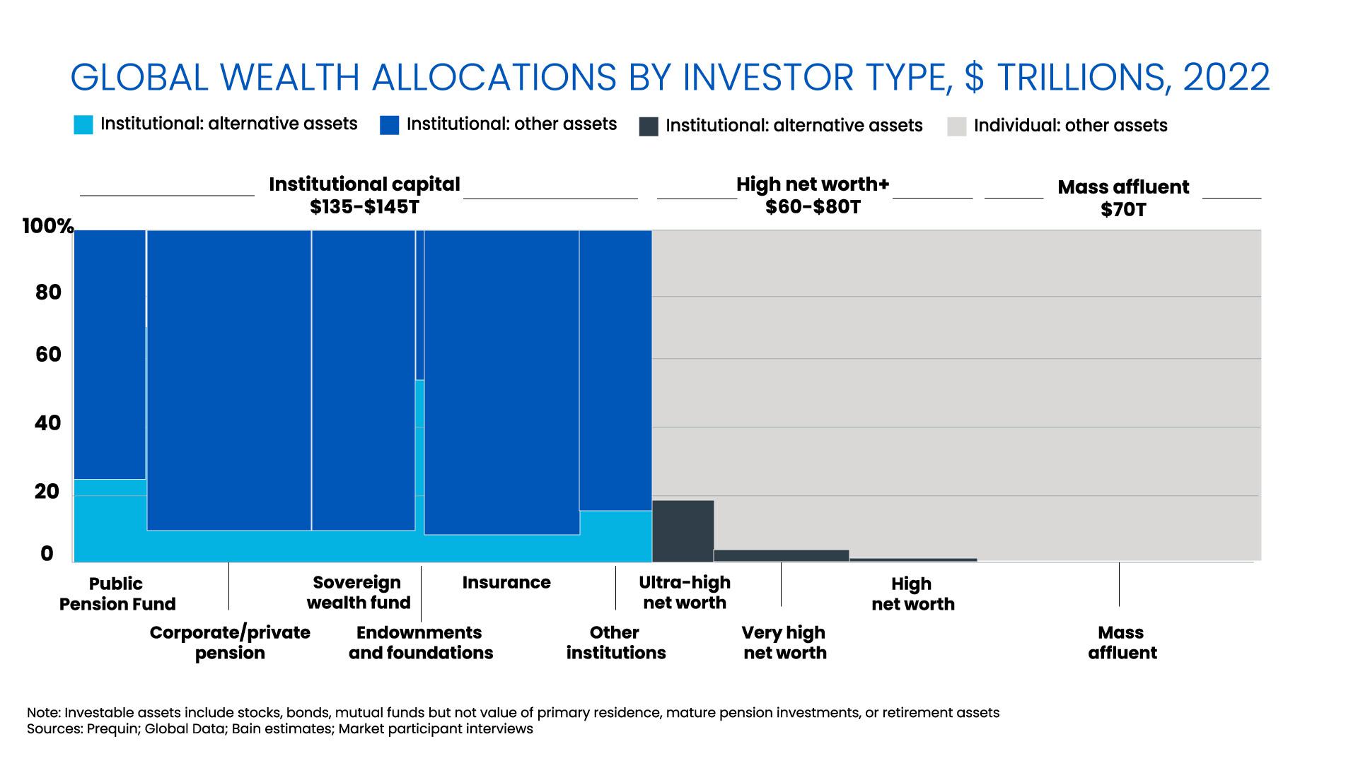 This is common: according to a 2022 study by management consulting firm Bain & Company, high-net-worth individuals—those with a net worth of $1 million or more—are “significantly under-allocated to alternatives, with only about 5% allocated in their portfolios.”2